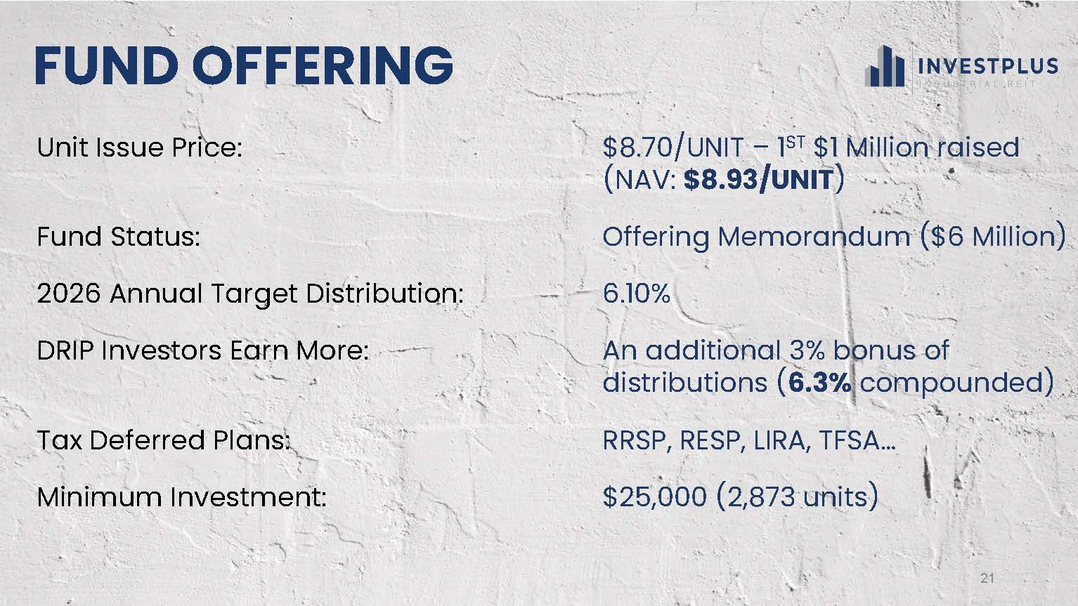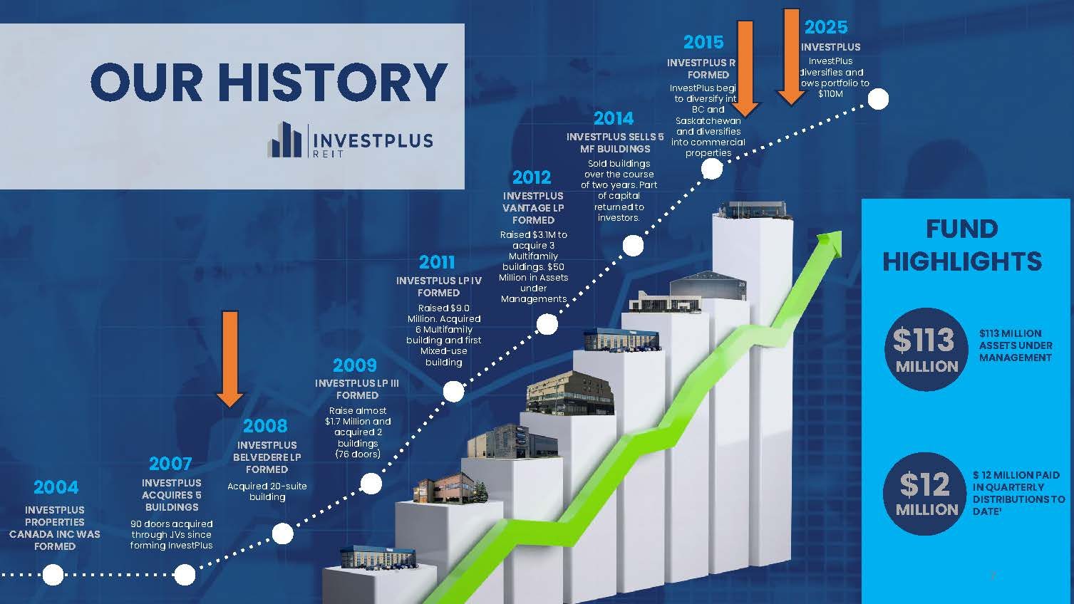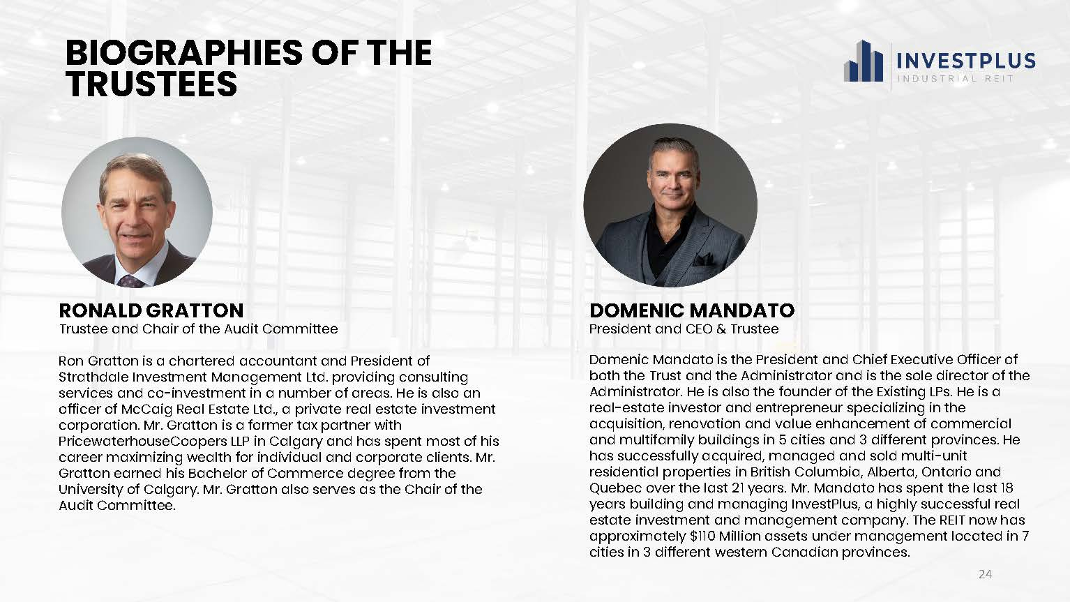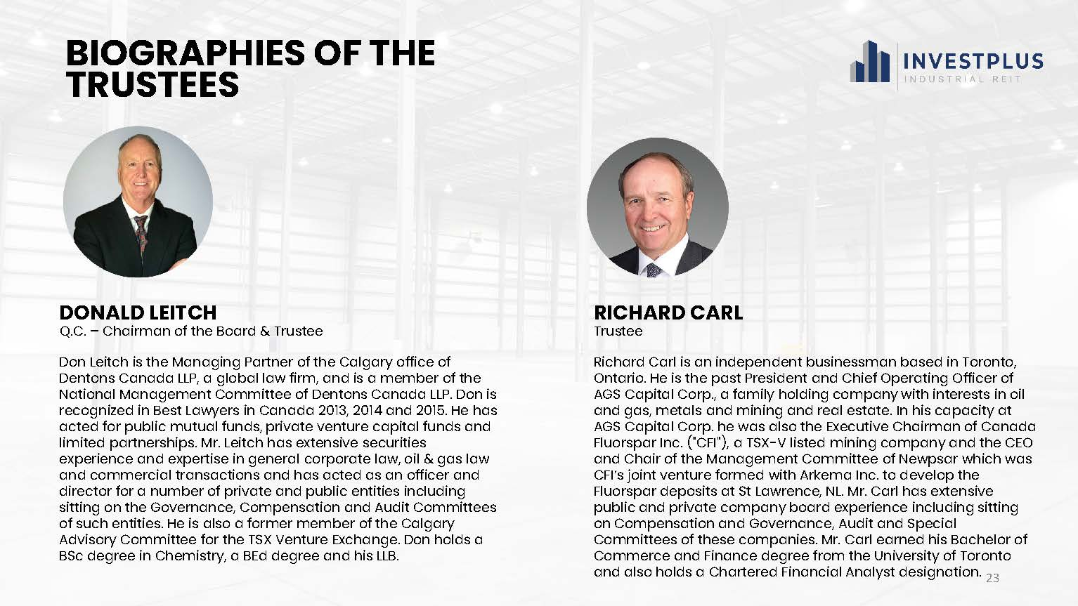 The Trust plans to invest its funds into InvestPlus Real Estate Investment LP, which will purchase residential and industrial properties via other Limited Partnerships. The Trustees of the Trust are Domenic Mandato, Donald Leitch, Ronald Gratton, and Richard Carl.